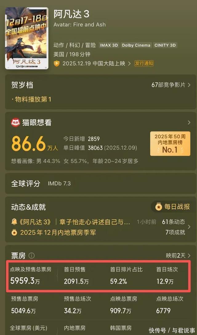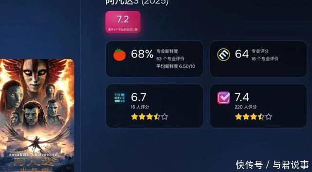 第三点,口碑问题,“偏科”严重。 现在的观众们其实都很聪明了,一部电影上映,除非是粉丝回去冲预售,大部分人都会等上两三天,看到口碑稳定之后再去电影院,以免上了“地球最后的夜晚”之流的当了。 看看《哪吒2》都清楚了,刚开始的时候,猫眼上给出的预测才40多亿 ,但过了两天口碑炸裂,预测就提升到了70亿,接连逆跌了好几天了。 而《阿凡达3》的口碑如何呢,有不少人都看了点映了,口碑也新鲜出炉了。 在烂番茄上,新鲜度是68%,观众评分还没有出来,算是相当平庸的成绩了,甚至比不上第二部(第一部可是80%了)。